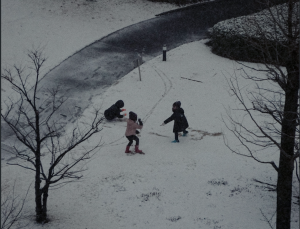 While pointing to a snowman hastily made because the cold numbed his hands.